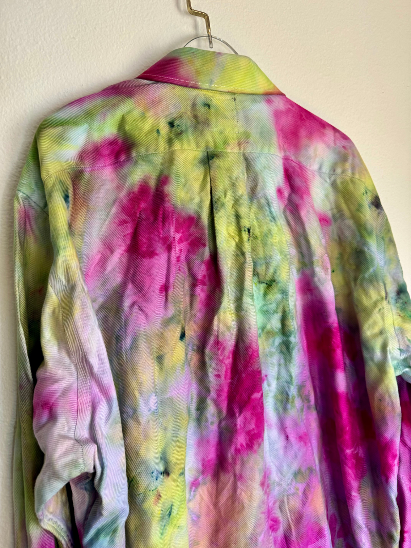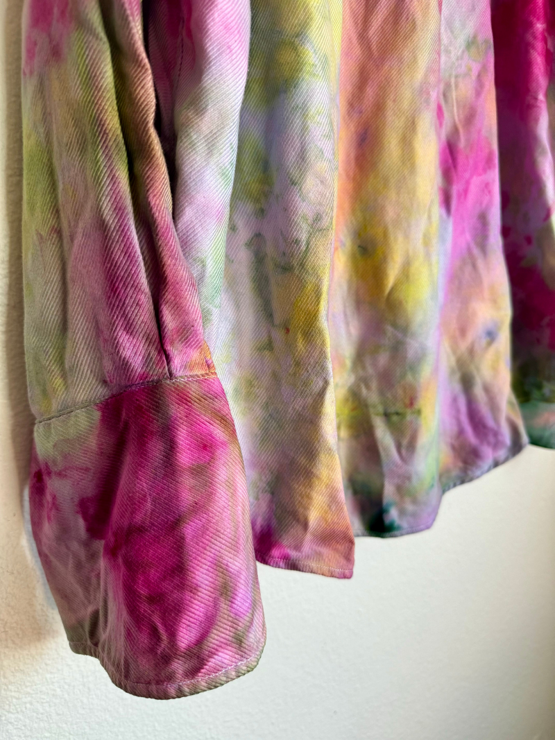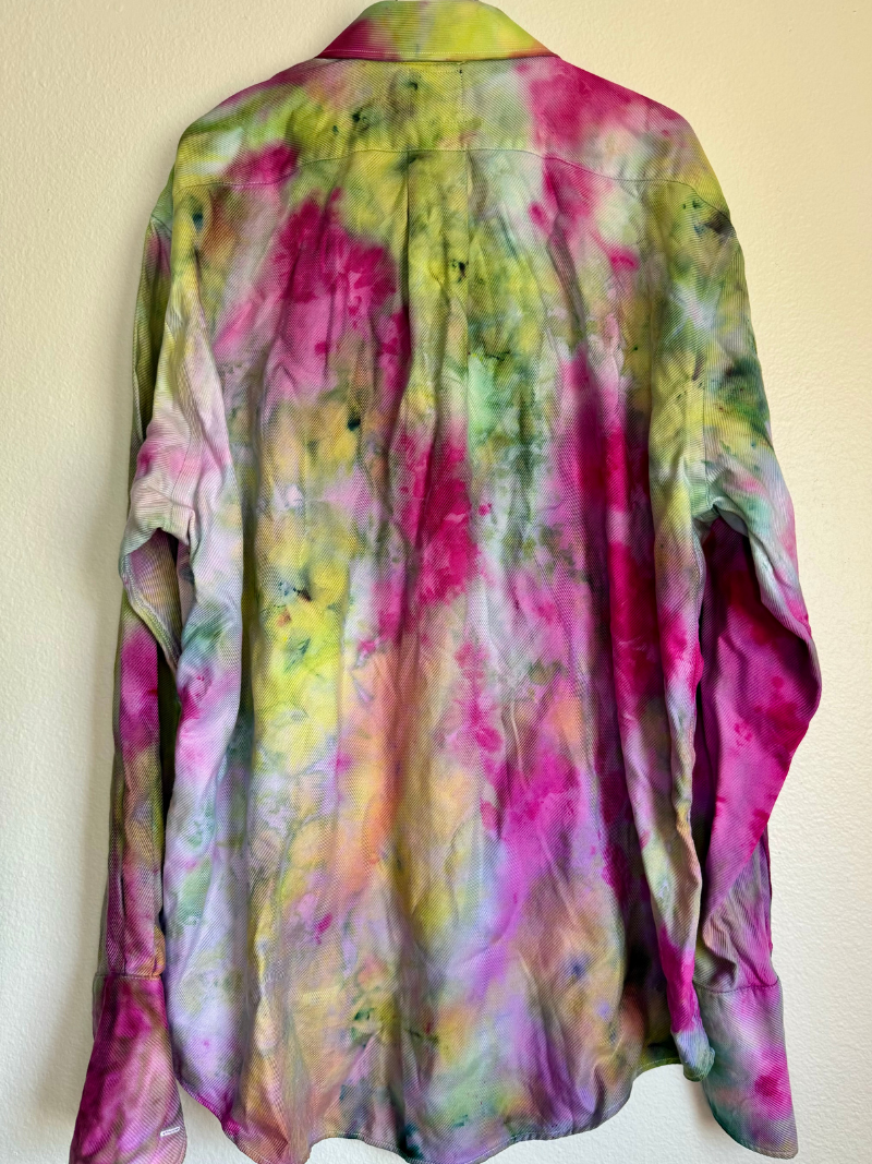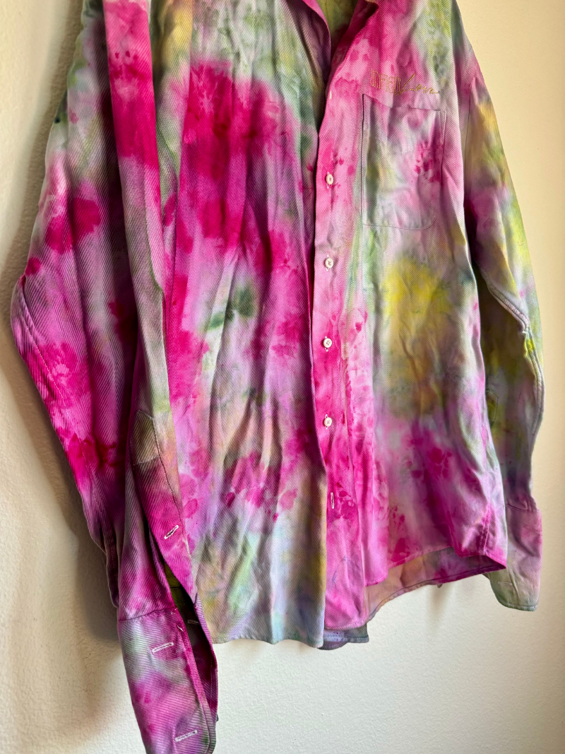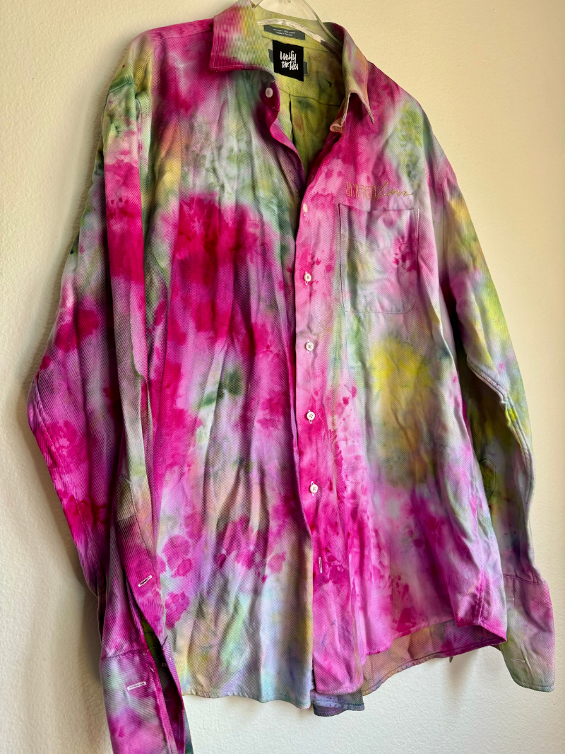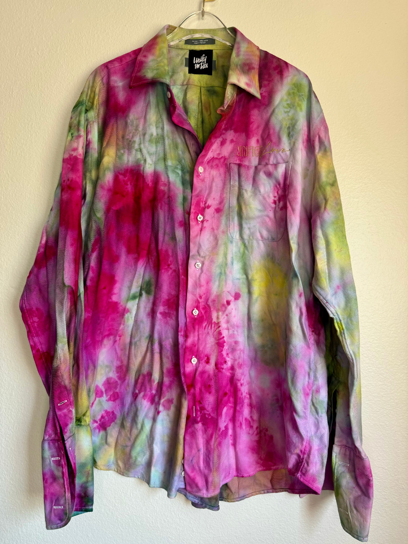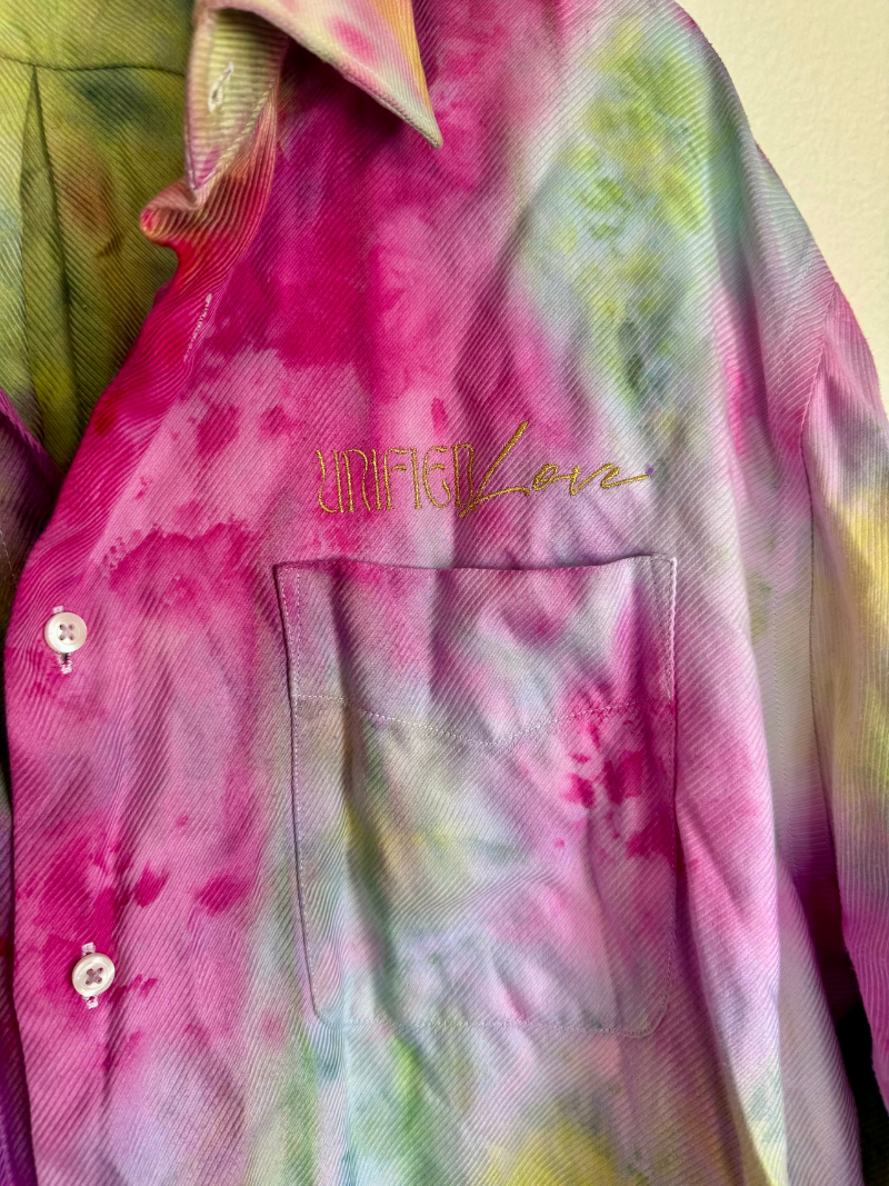 Hand dyed up-cycled wearable art with embroidered "Unified Love" in gold thread. Featuring gold cuff links for an added touch of magick!