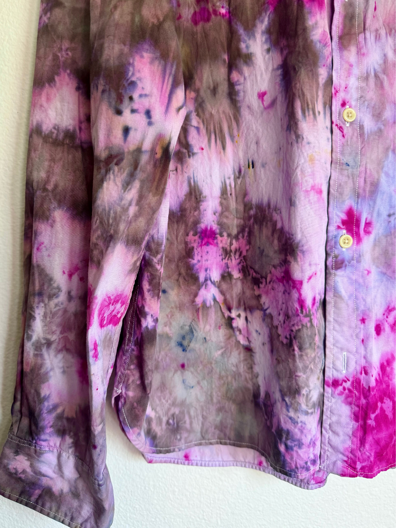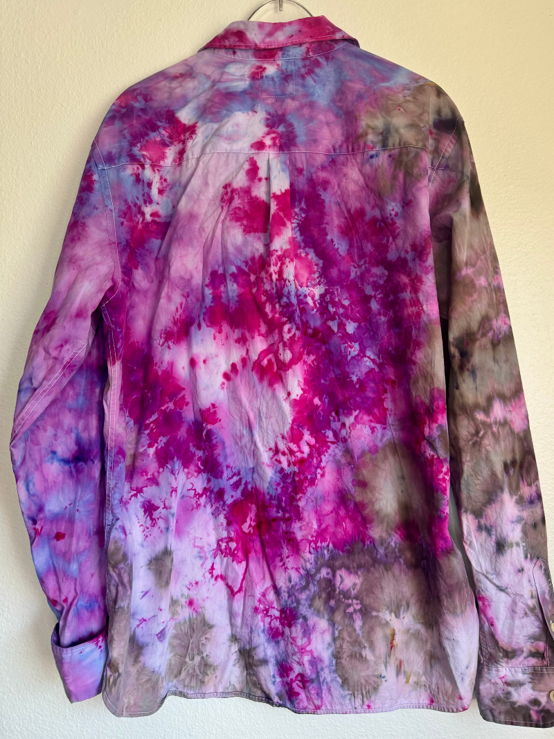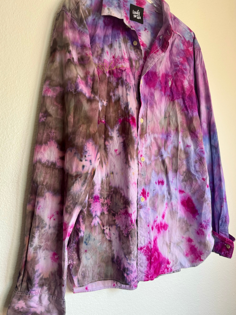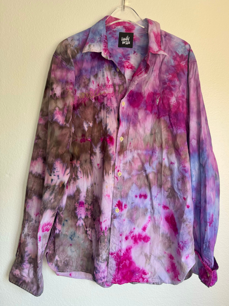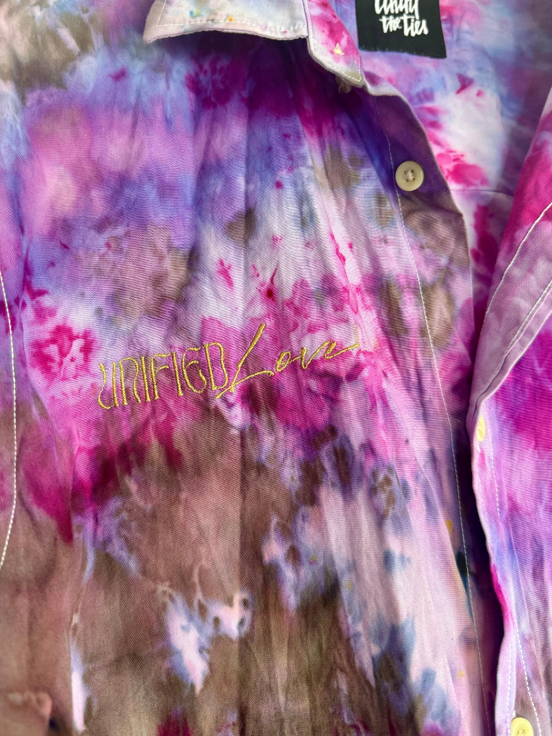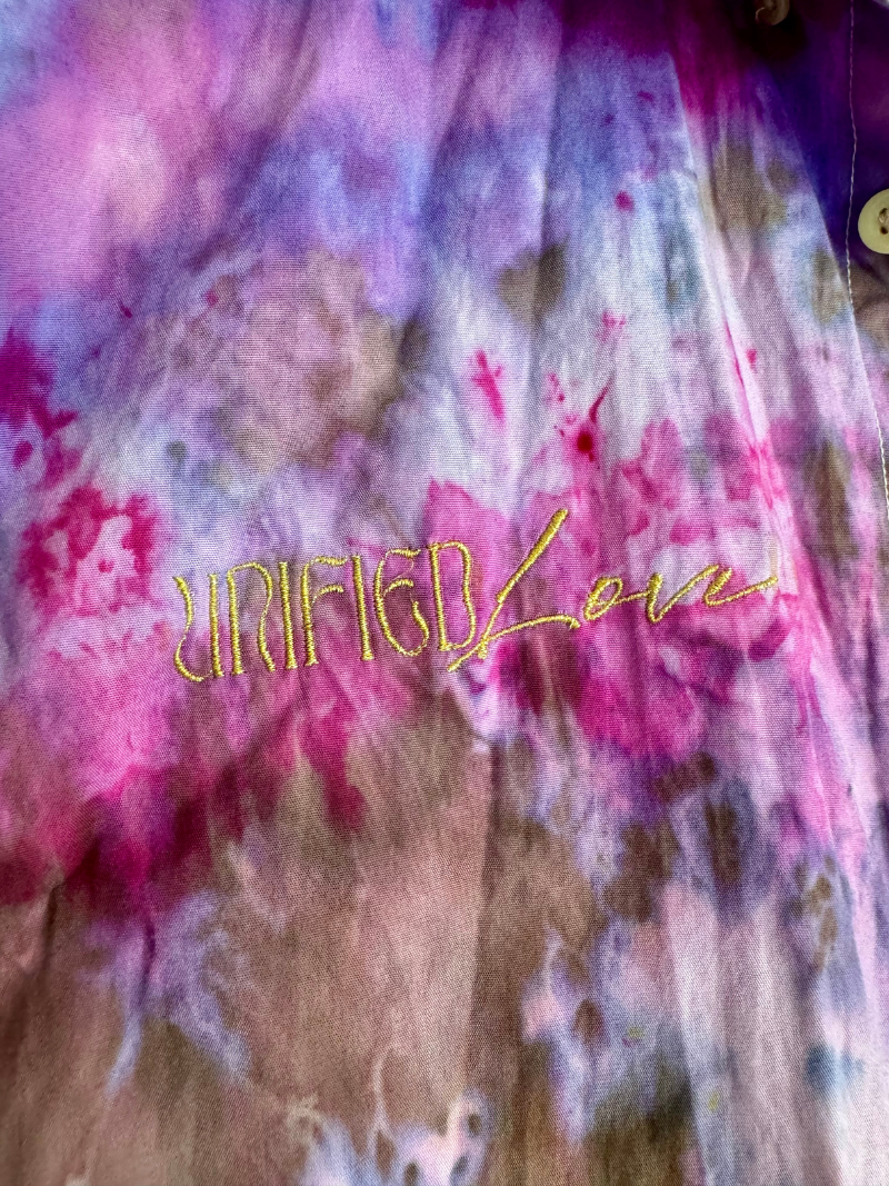 Hand dyed up-cycled wearable art with embroidered "Unified Love" in gold thread.