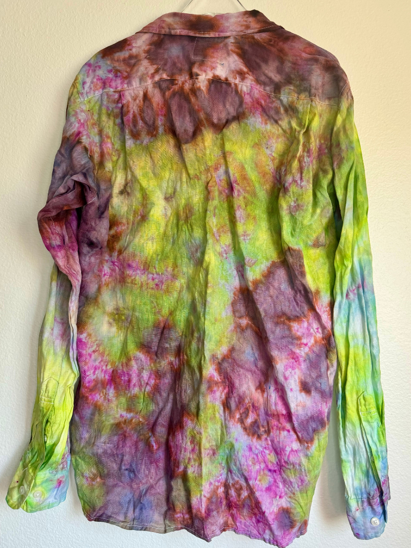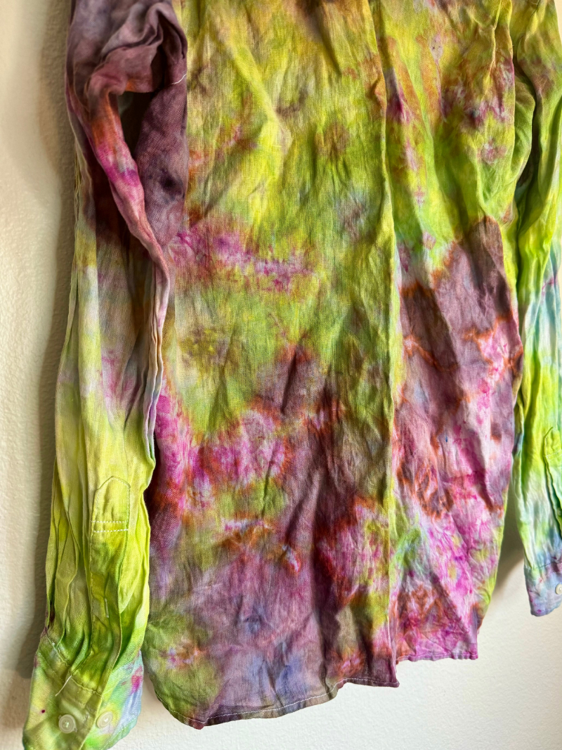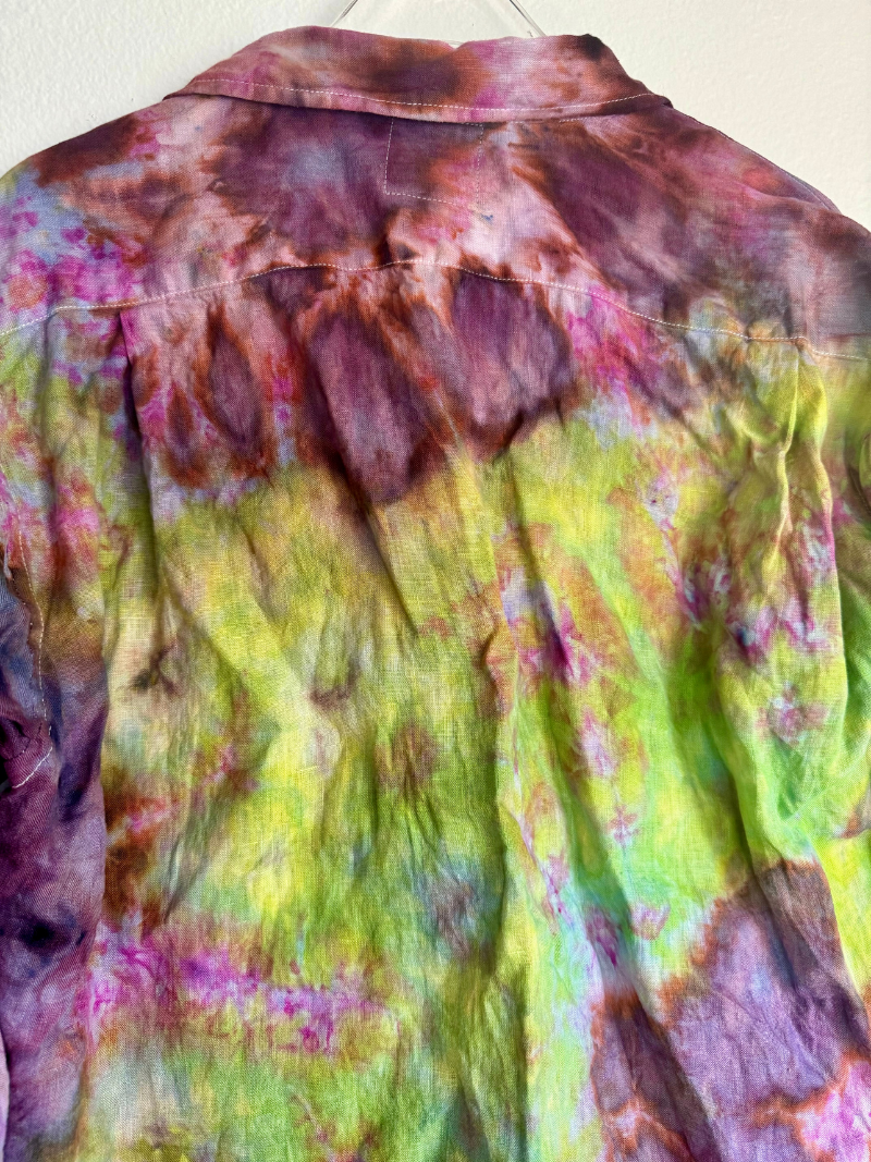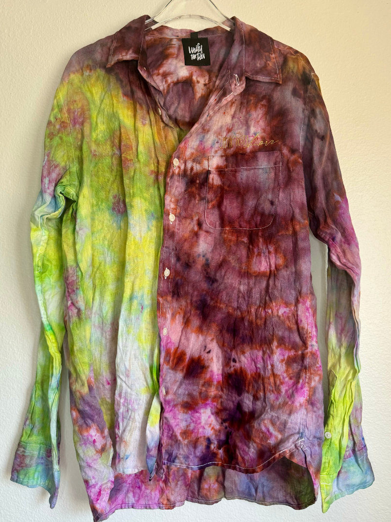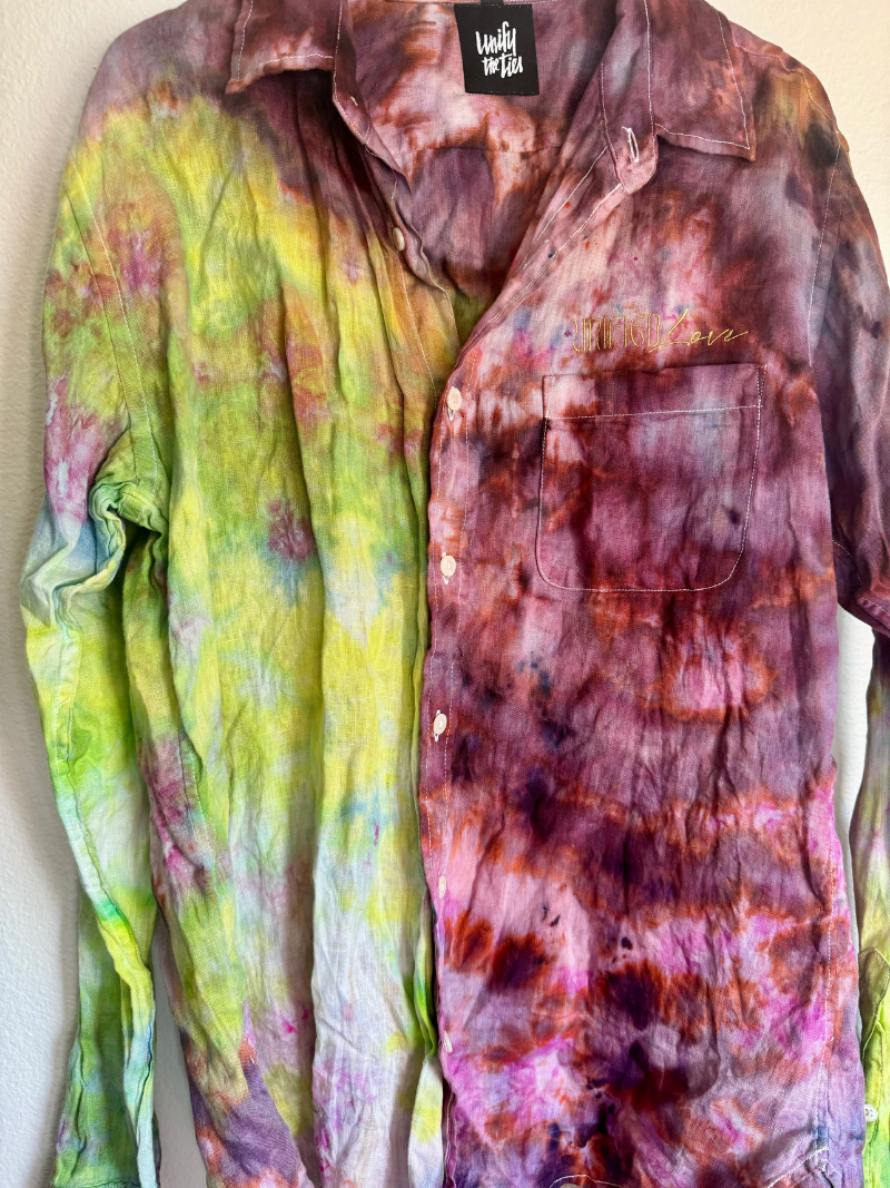 Hand dyed up-cycled wearable art with embroidered "Unified Love" in gold thread.