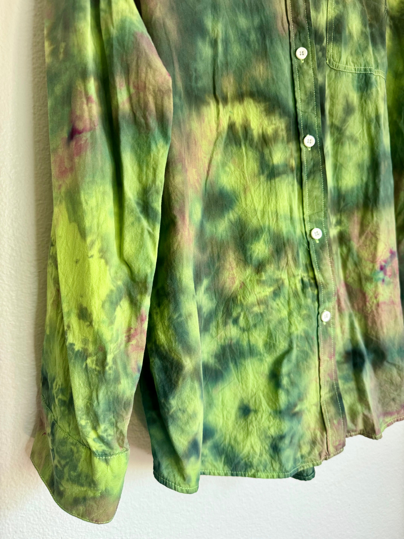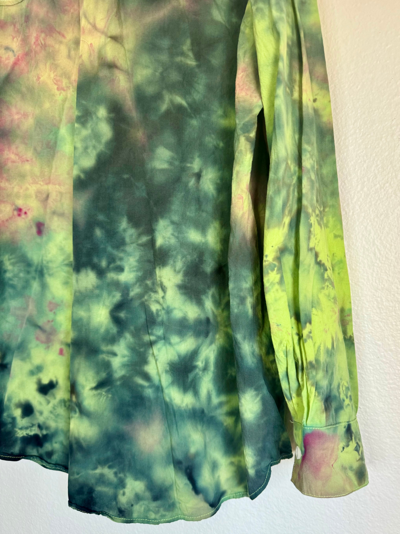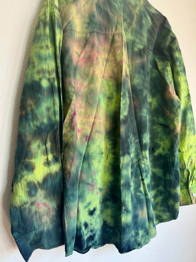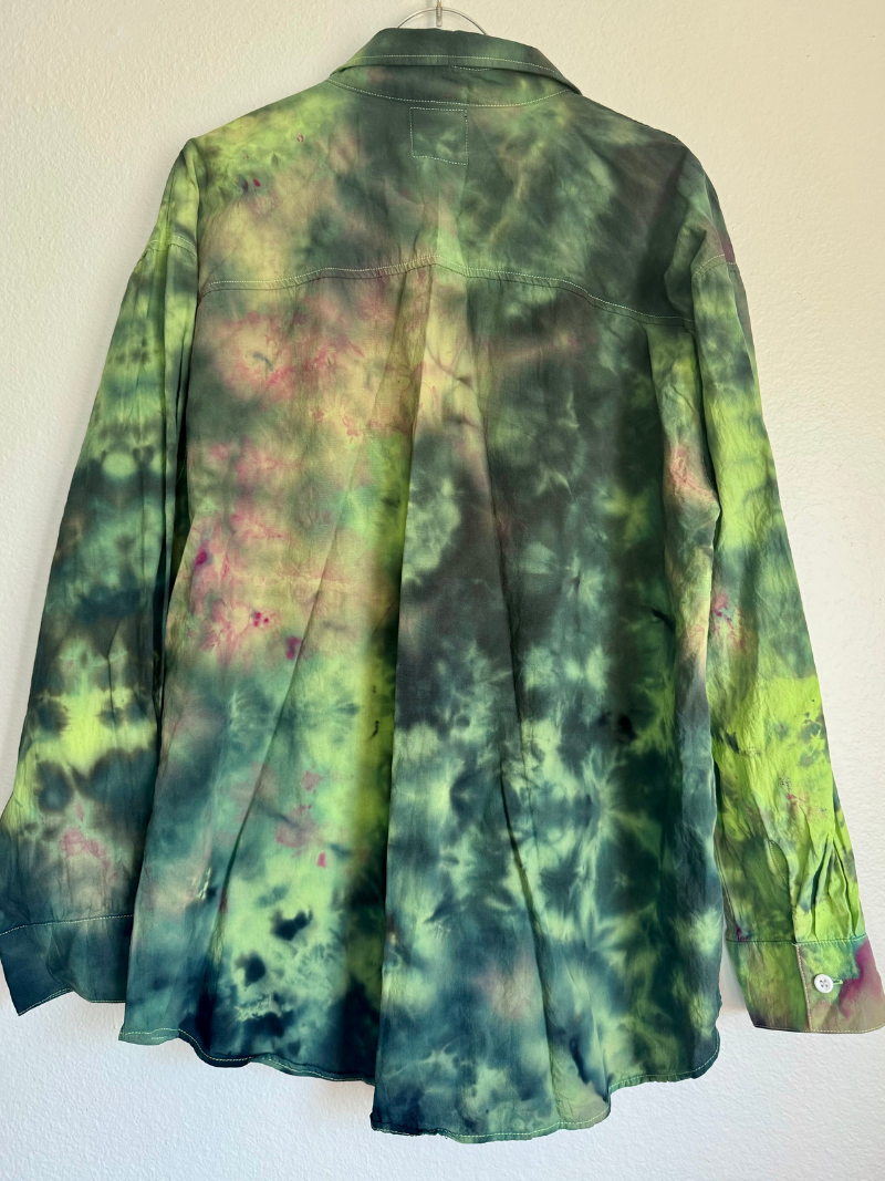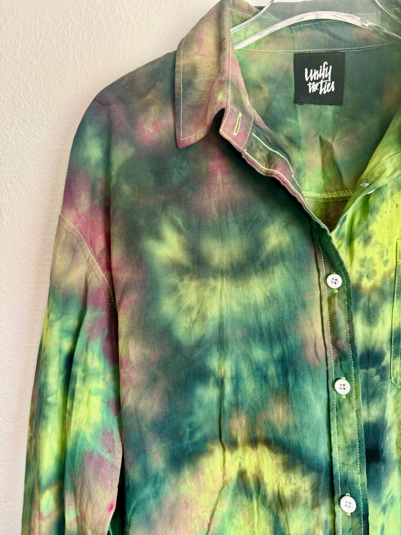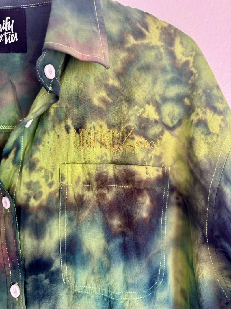 Hand dyed up-cycled wearable art with embroidered "Unified Love" in gold thread.