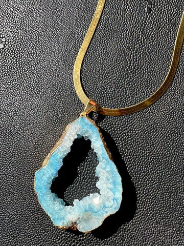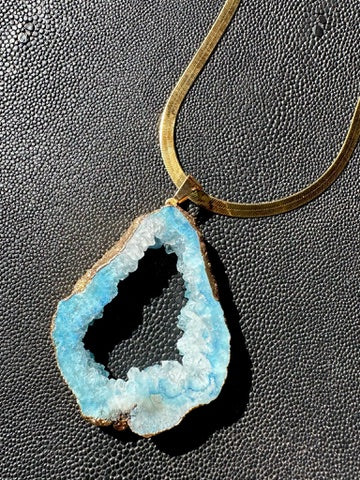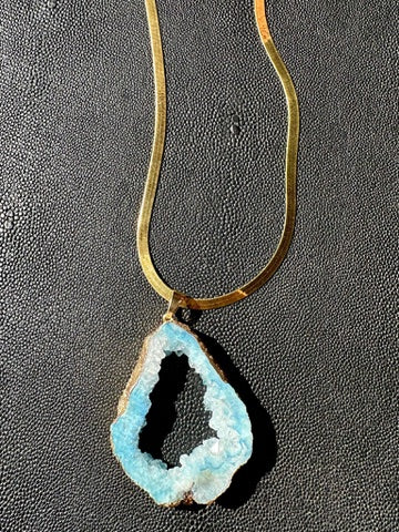 Blue Geode pendant paired with a 14k gold coated herringbone chain