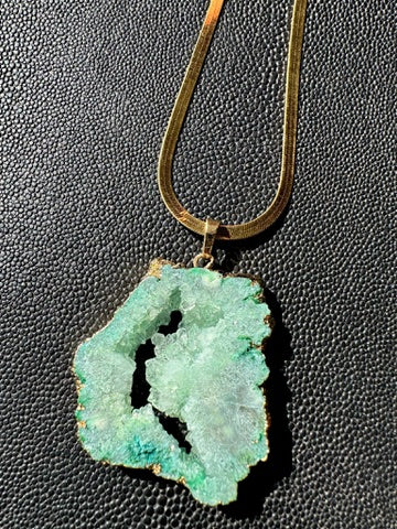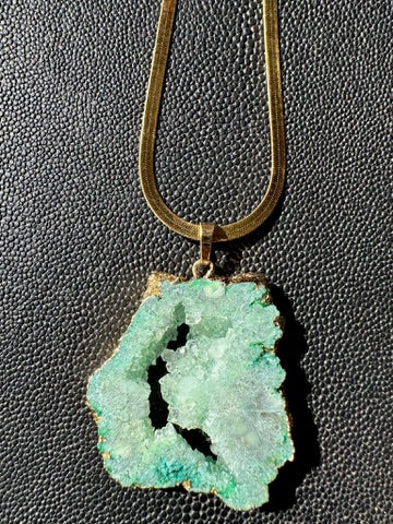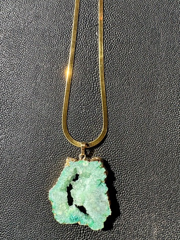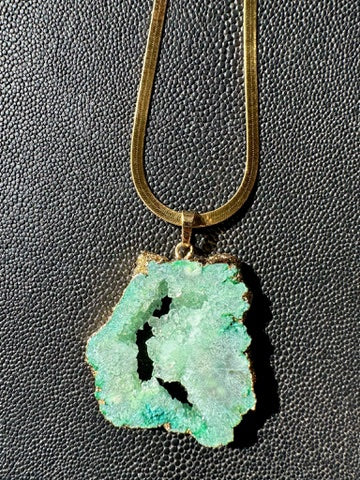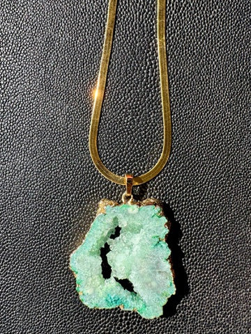 Green Geode pendant paired with a 14k gold coated herringbone chain.