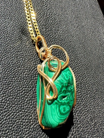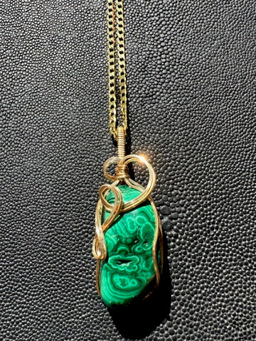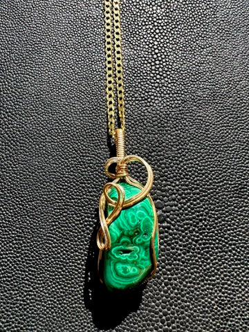Malachite wire wrapped pendant paired with a 14k gold plated curb chain