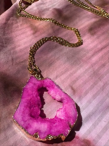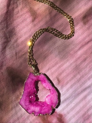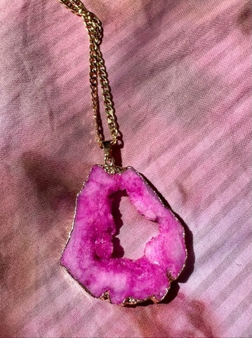 Pink Geode pendant paired with a 14K gold coated curb chain.