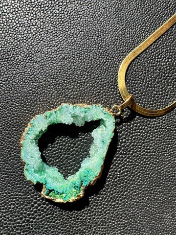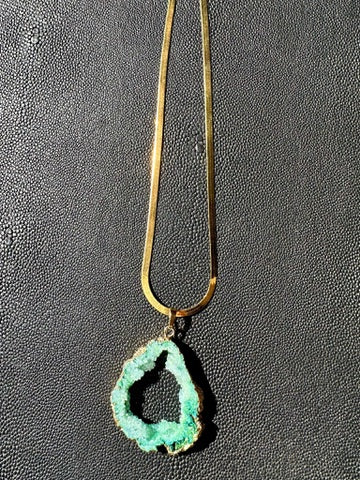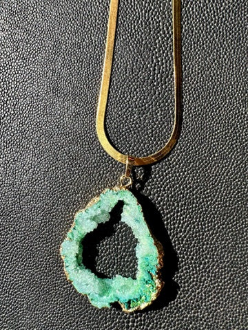 Green Geode pendant paired with a 14k gold coated herringbone chain.