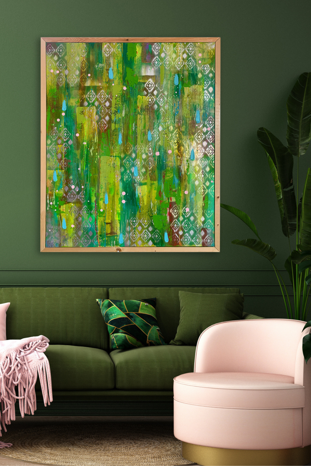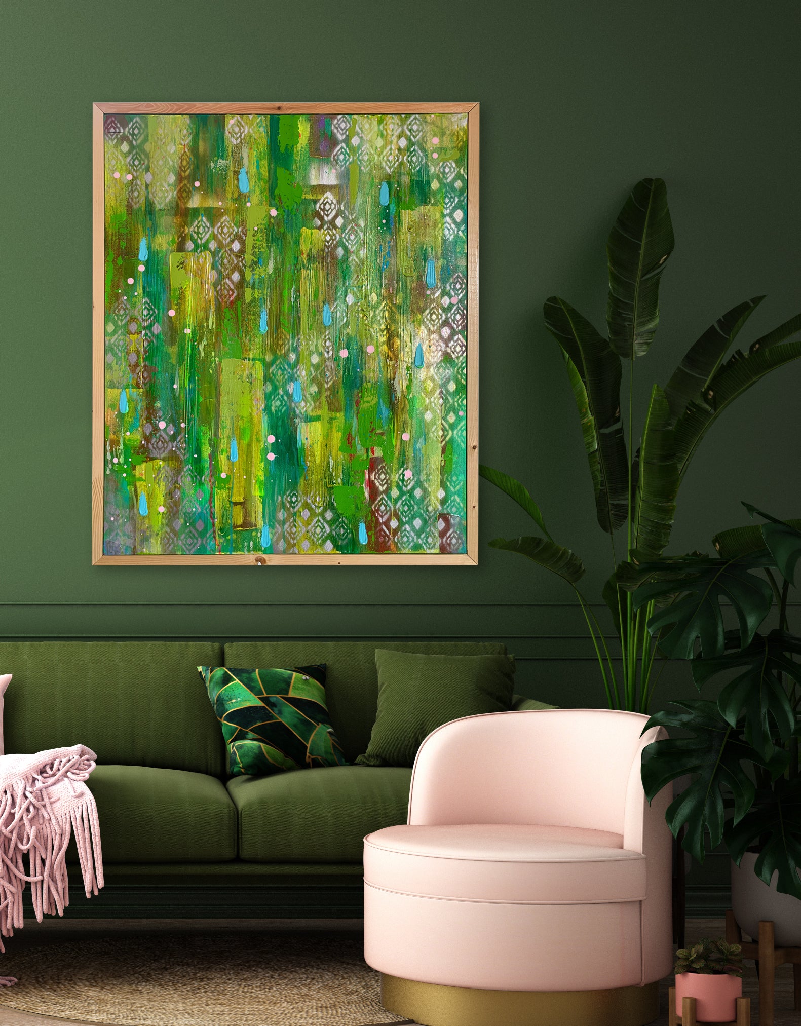 Stretched and mounted within an oak wood frame ready for hanging.