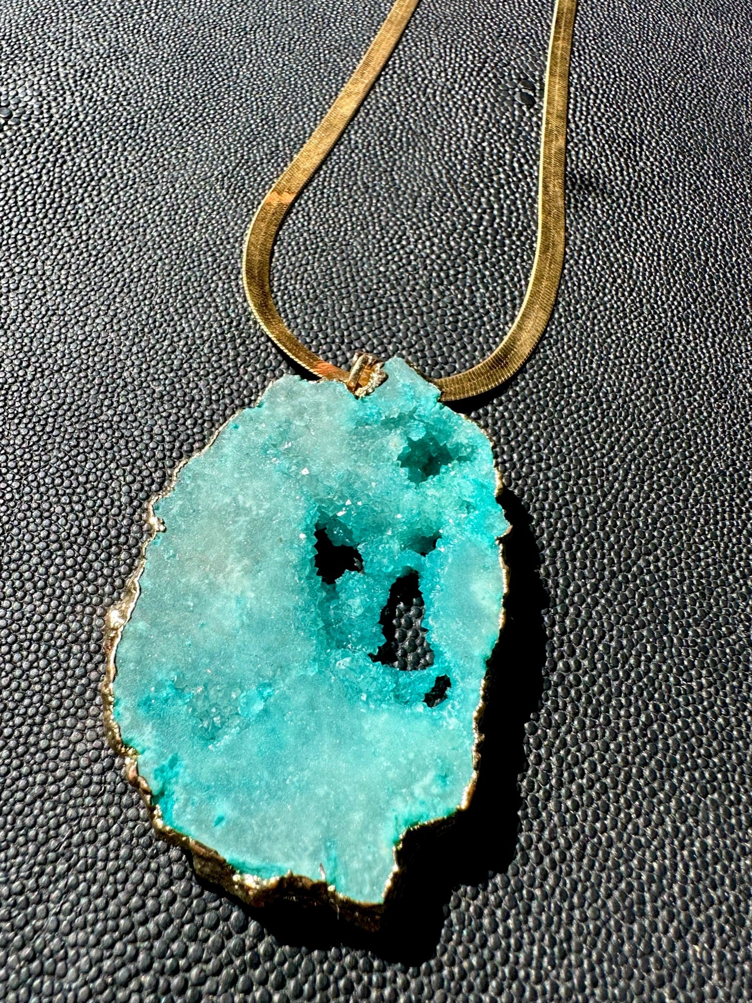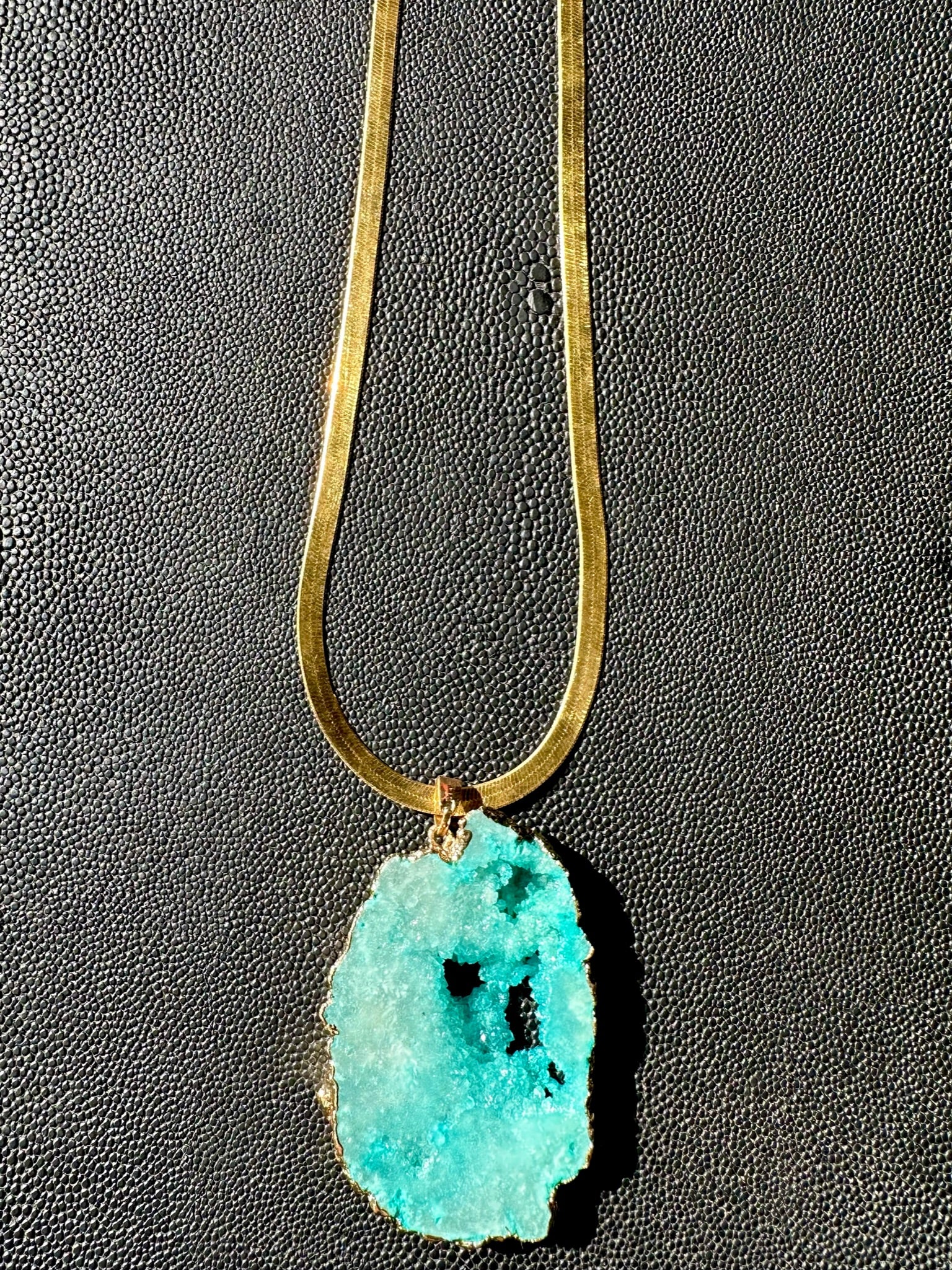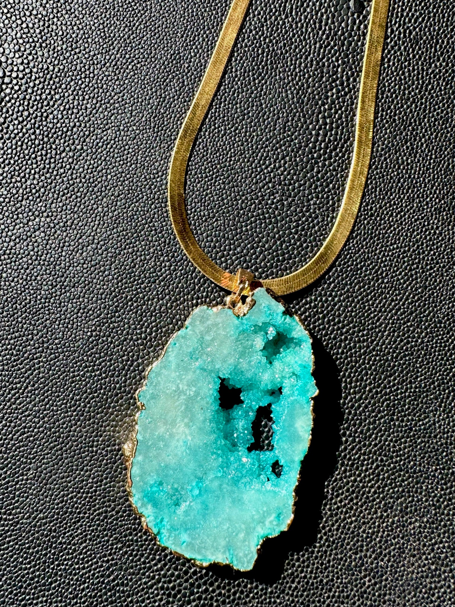 Blue Geode pendant paired with a 14k gold coated herringbone chain.